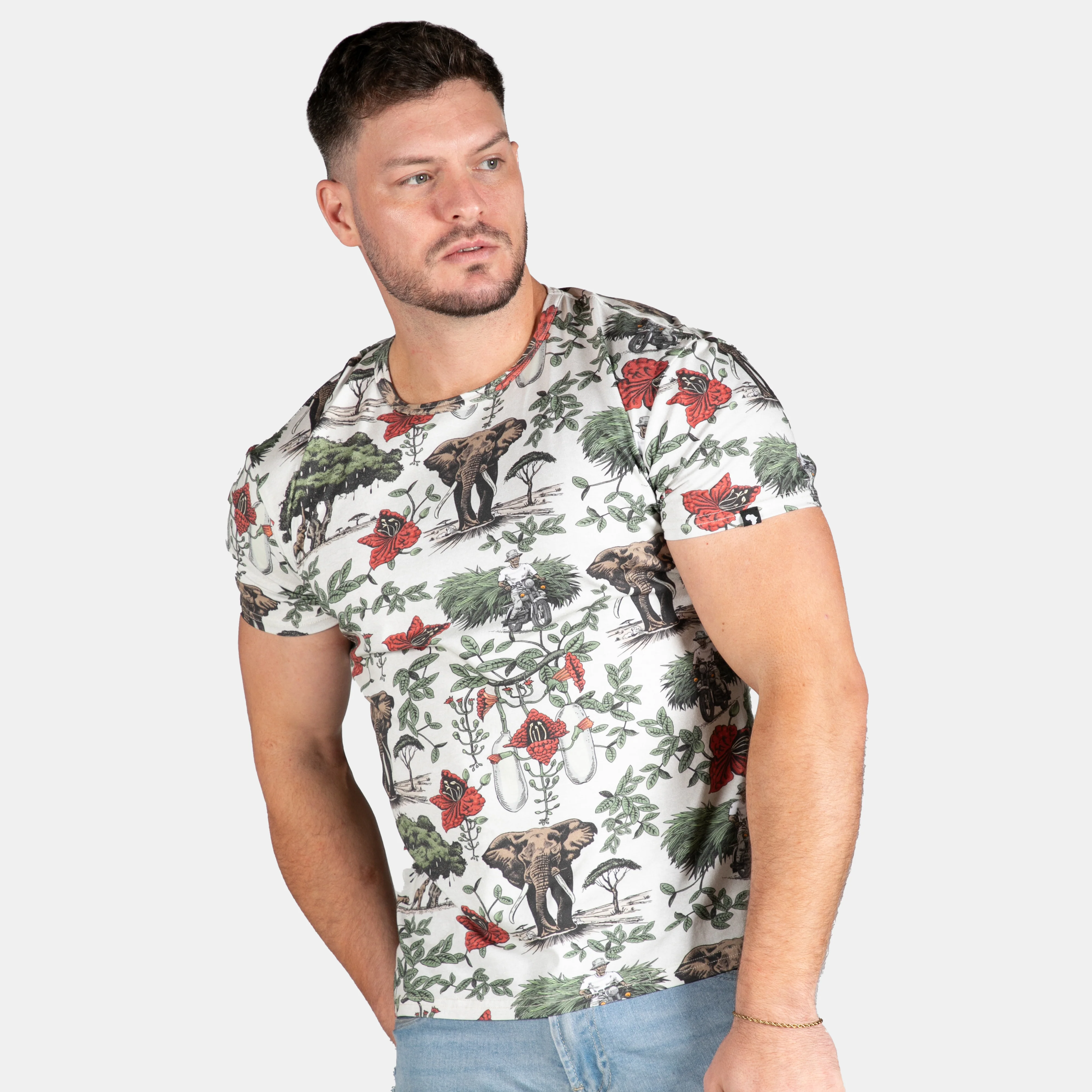 This full print t-shirt for men is fitted, has a round bound neck and short sleeves.