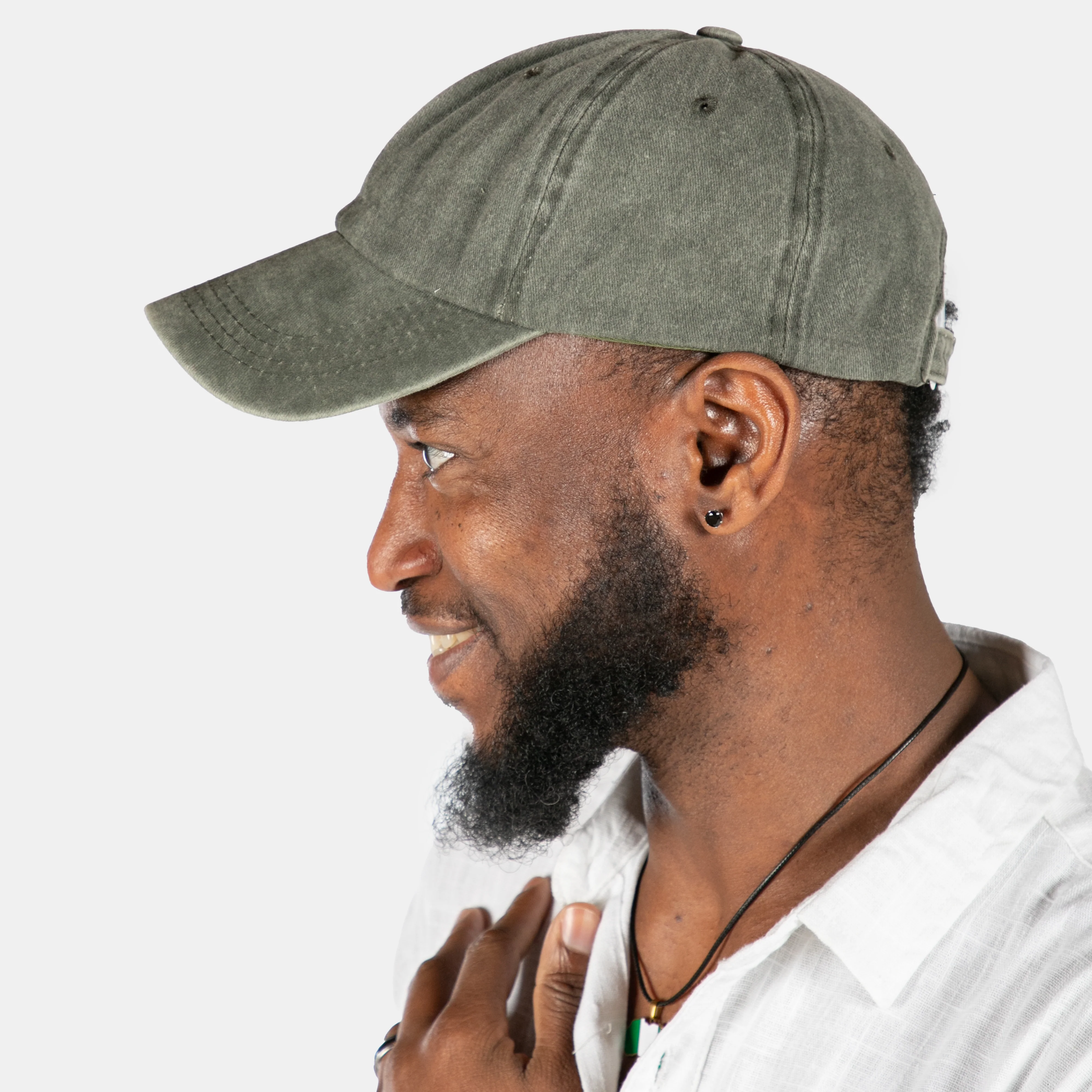 Simple 6-panel baseball cap with unstructured front panels. Clip clasp at the back and standard peak in front.