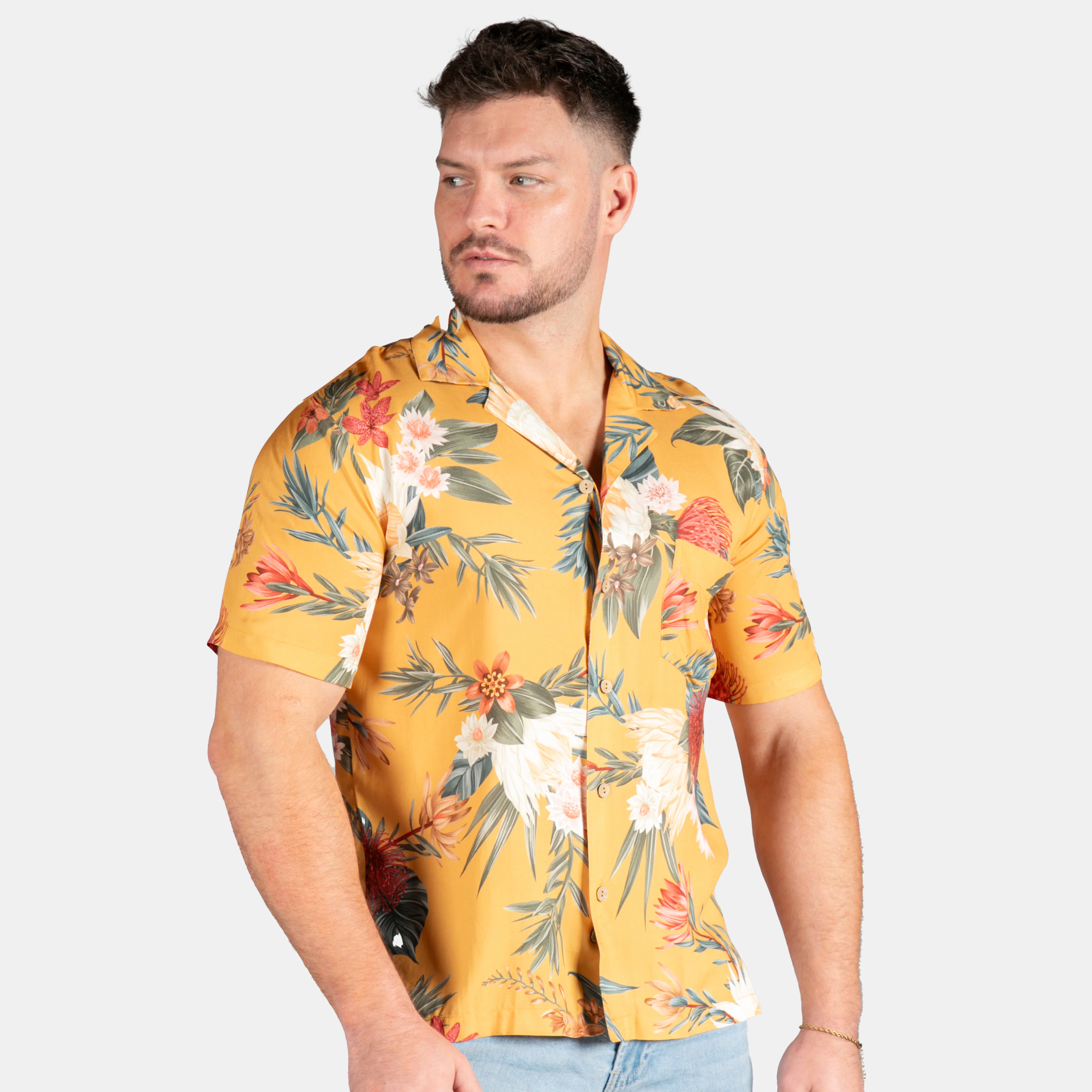 This safari style shirt boasts the most amazing masculine flora print and is tailored to flatter every male torso.