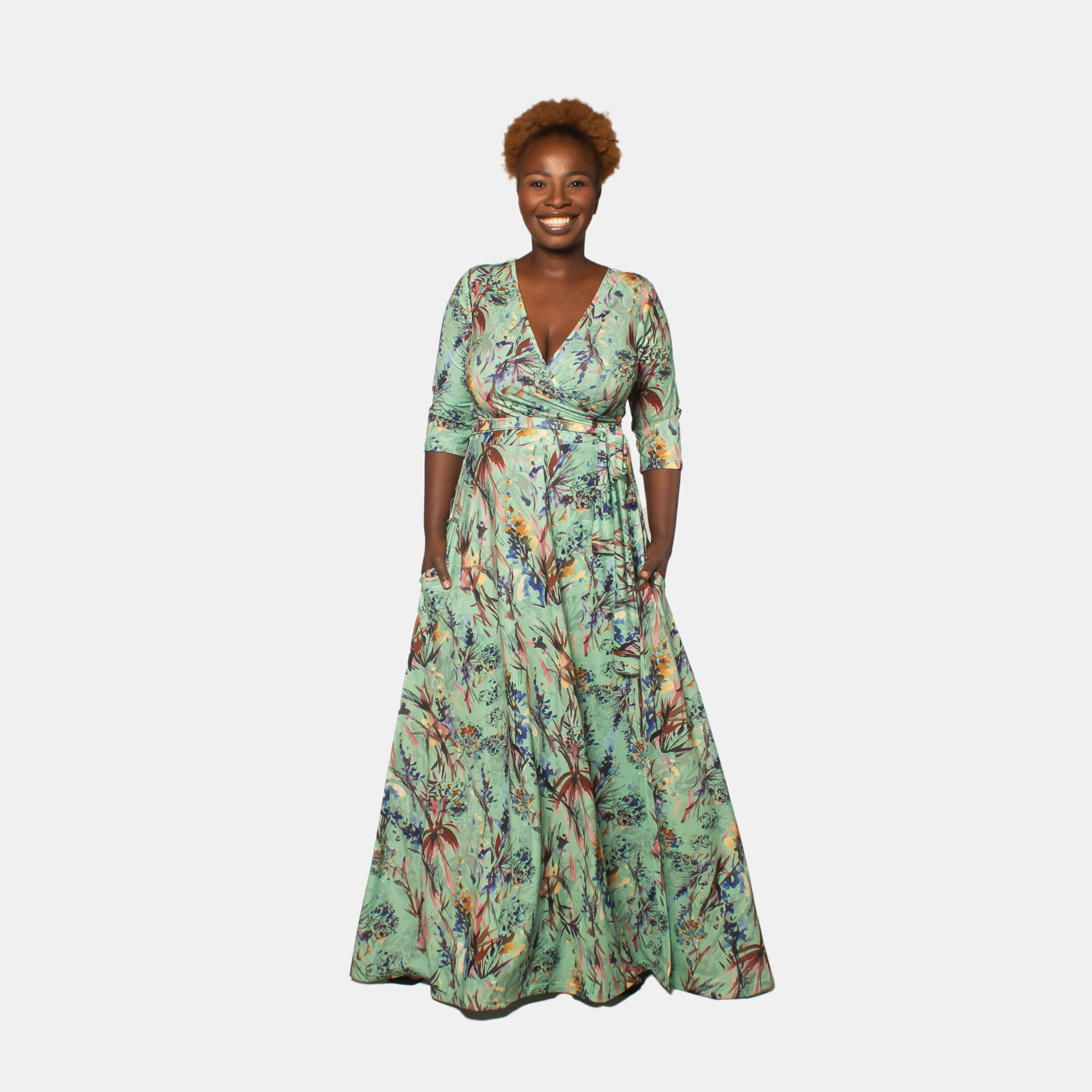 This graceful wrap dress combines style with thoughtful details in the crossover wrap design, three-quarter sleeves, and a flowing floor-length skirt that moves beautifully with you. Practical side-seam pockets add everyday functionality, while the gentle stretch fabric drapes softly taking your shape. Perfect for occasions that call for understated sophistication and comfort.