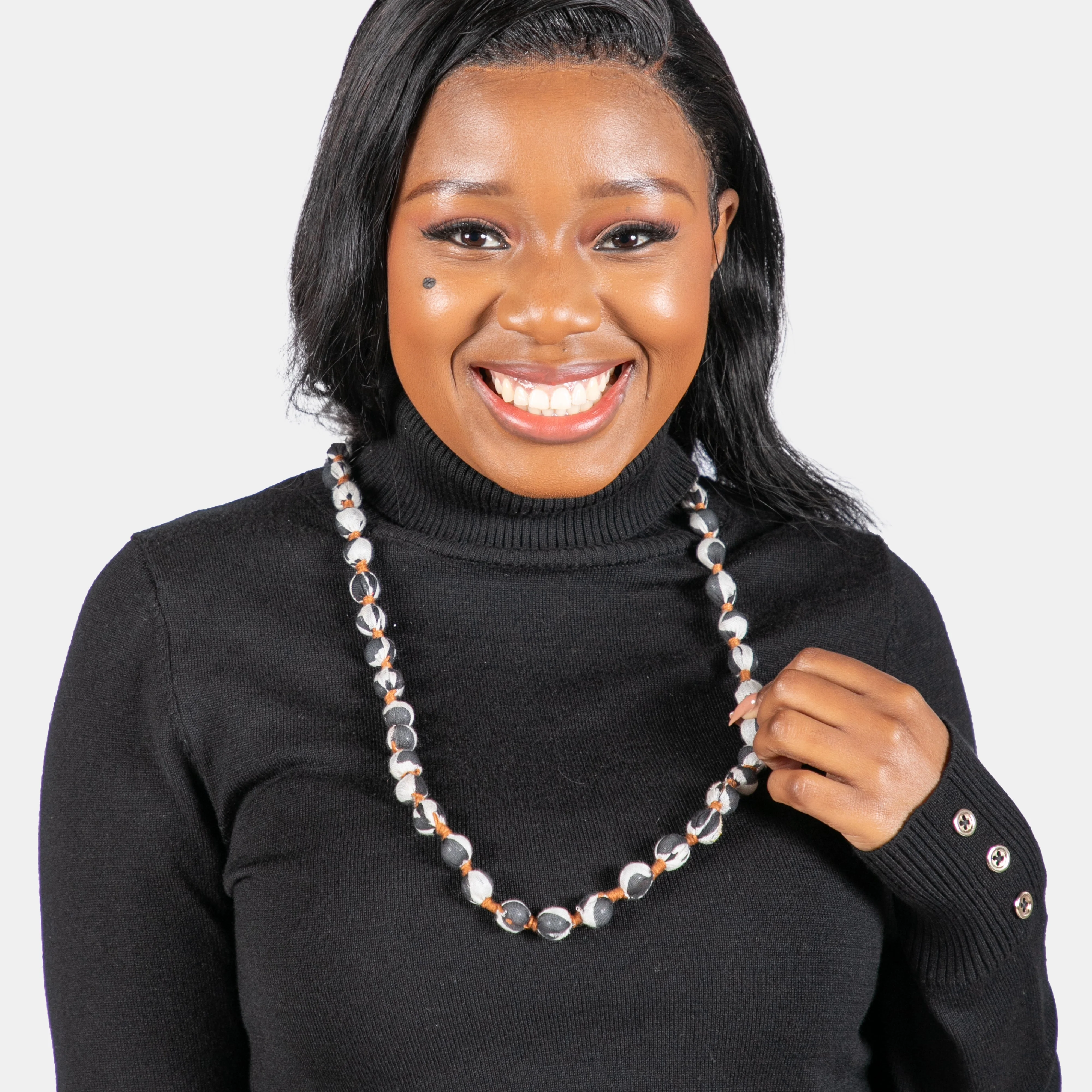 Colourful fabric covered beads create a string of joy around your neck. Available in three colours. Wear them all together for a unique statement this season.