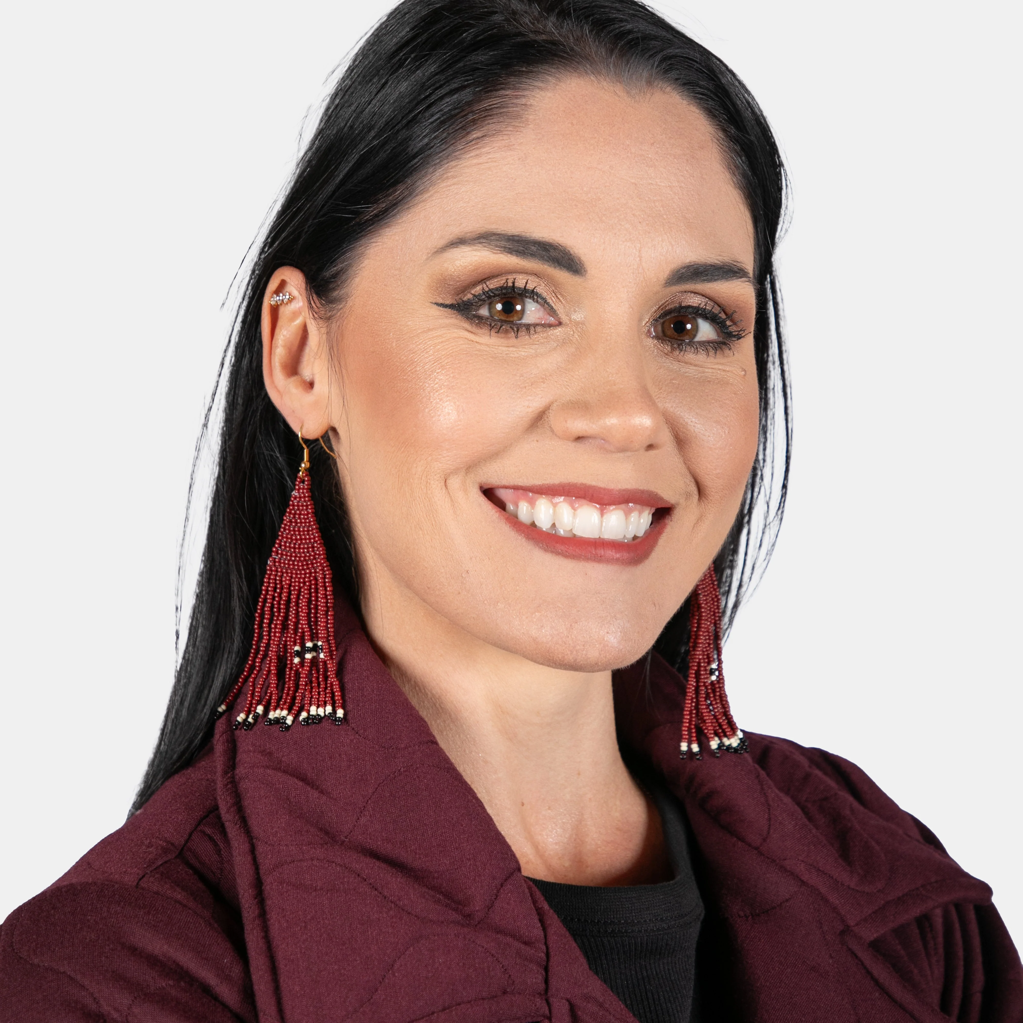 The Harriet earrings are a thoughtfully curated design of delicately hand beaded seed beads. A triangle shape at the ear extending to long tassels. Harriet is available in the perfect colour for winter - Ruby.