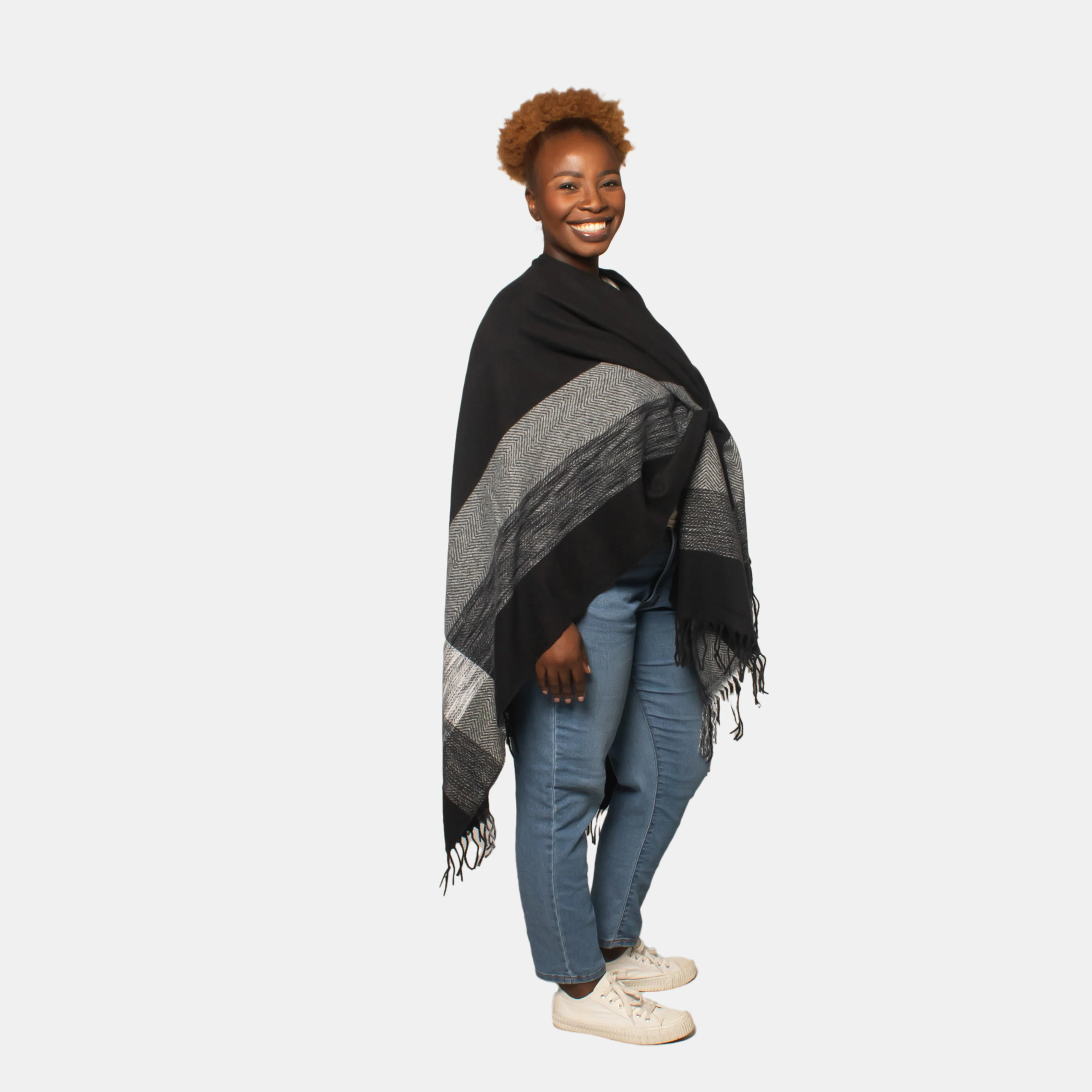 With cooler weather on the horizon, this wraps suits those transitional months and has you looking stylish whilst keeping warm. Crafted from the softest cloth, it features black and grey stripes and a thread through panel at the front to keep it in place.