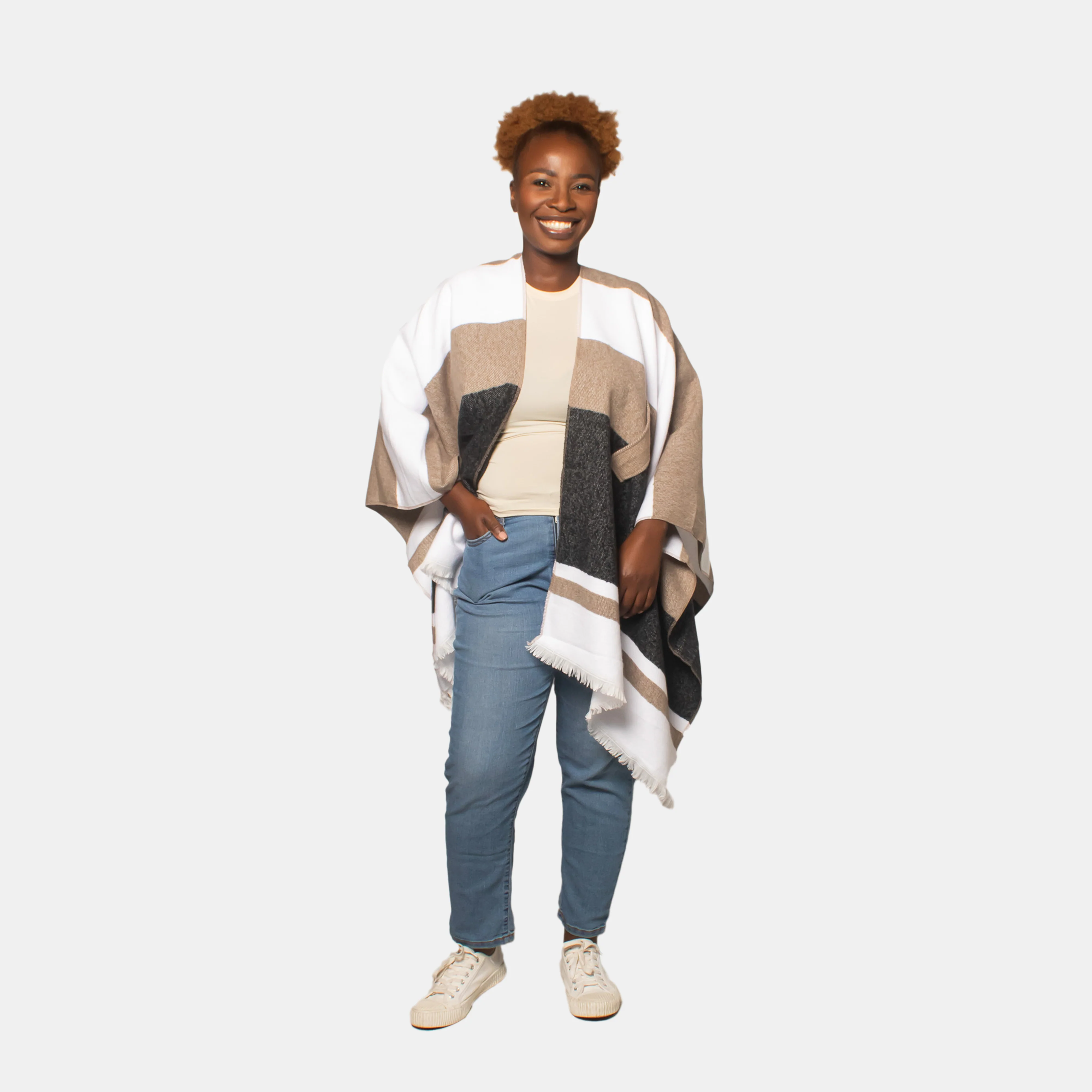With cooler weather on the horizon, this wraps suits those transitional months and has you looking stylish whilst keeping warm. Crafted from the softest cloth, it features White, Cream and Black stripes and a thread through panel at the front to keep it in place.