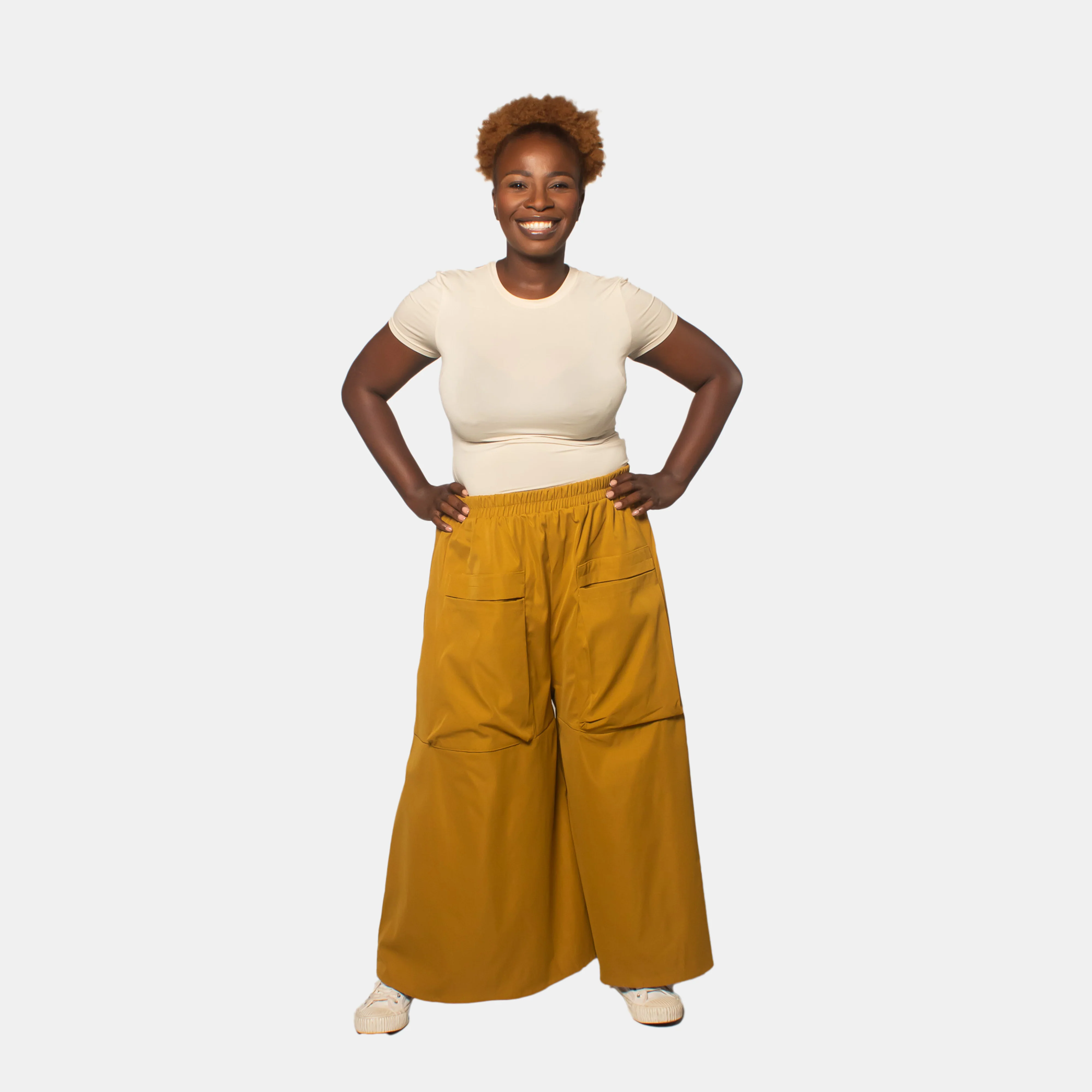 These statement pants feature dramatically wide legs that flow like a skirt while delivering the comfort and practicality of traditional trousers. The elasticated waistband ensures a secure, comfortable fit, while functional front patch pockets add contemporary edge. The warm mustard tone is a versatile wardrobe essential that pairs beautifully with everything from casual tees to elegant blouses. Perfect for those who refuse to compromise between comfort and fashion-forward design.