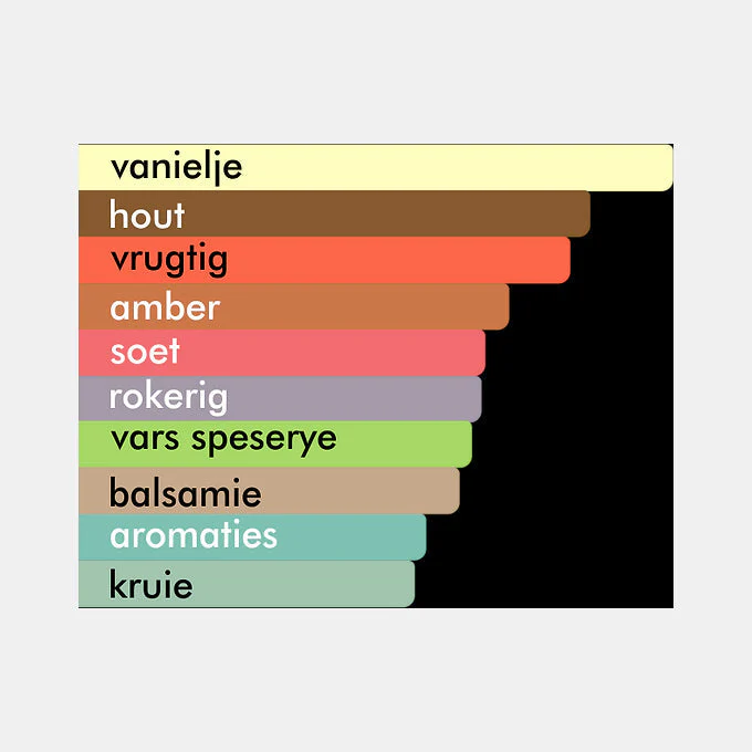 Voelvry (meaning free as a bird) is woody and citrusy. This perfume's top notes are filled with the invigorating and energizing freshness of lemon and mandarin contrasted with the herbaceous freshness of coriander. The heart note brings an aromatic sensuality with Labdanum, violet and rosemary.